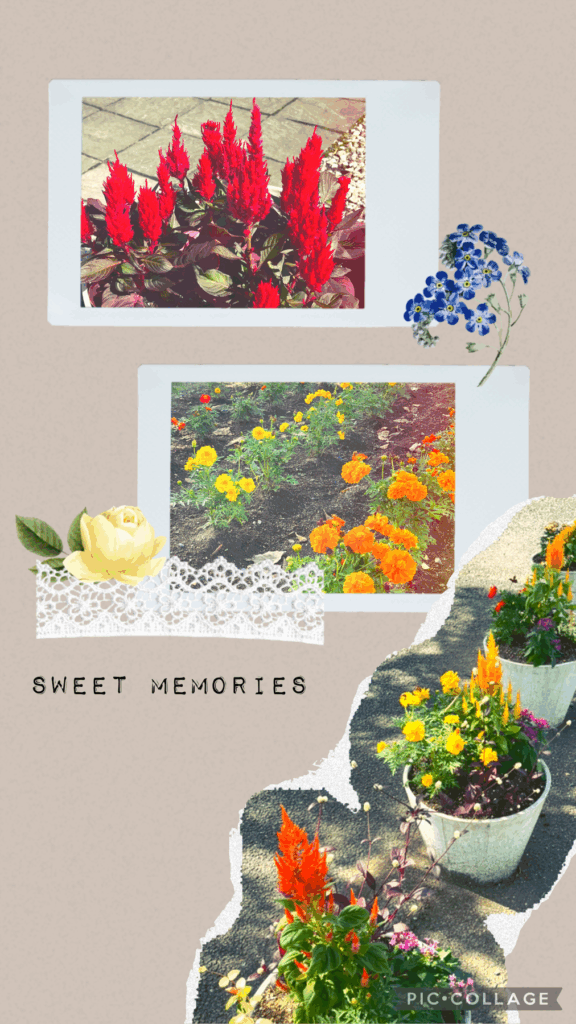 赤やオレンジの花が、秋晴れの空に映えてとってもきれいです。
