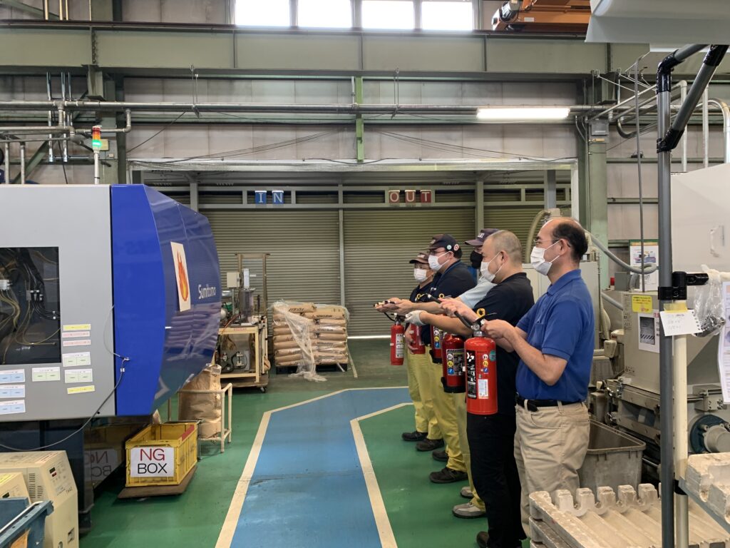 避難訓練① ε≡≡ヘ( ´Д`)ノ 2021.9.28 先日実施した避難訓練の様子です。 今回は第一工場成形機から出火!!! 写真は初期消火訓練の様子です。 消火班の方の性格が出ていますね。皆さん真っすぐ整列して初期消火しています(笑)