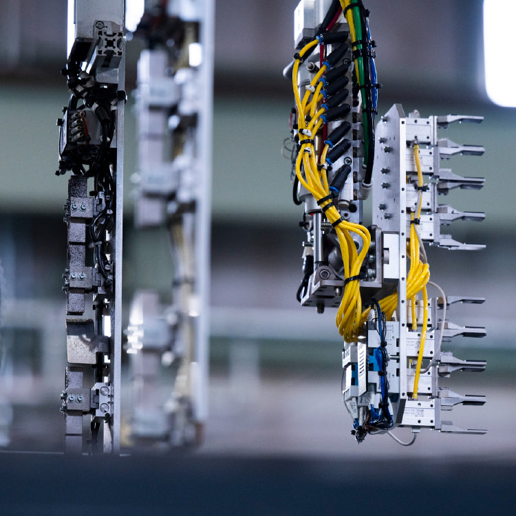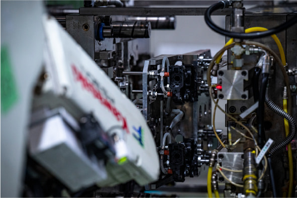 金型にインサート部品を挿入してから樹脂成形をして、他部材を一体成形する『インサート成形』。通常人手で行う作業を、当社では多関節ロボットの導入で自動化し、作業の効率化に取り組んでいます。